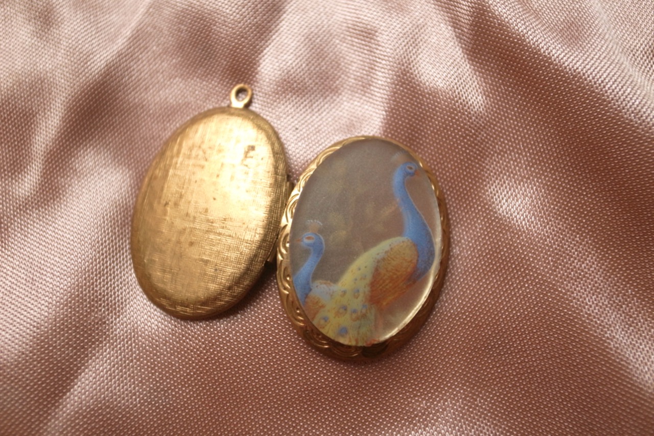 鏡のようなプレートに二羽の孔雀の描かれた、写真など入れられるロケットチャームです。