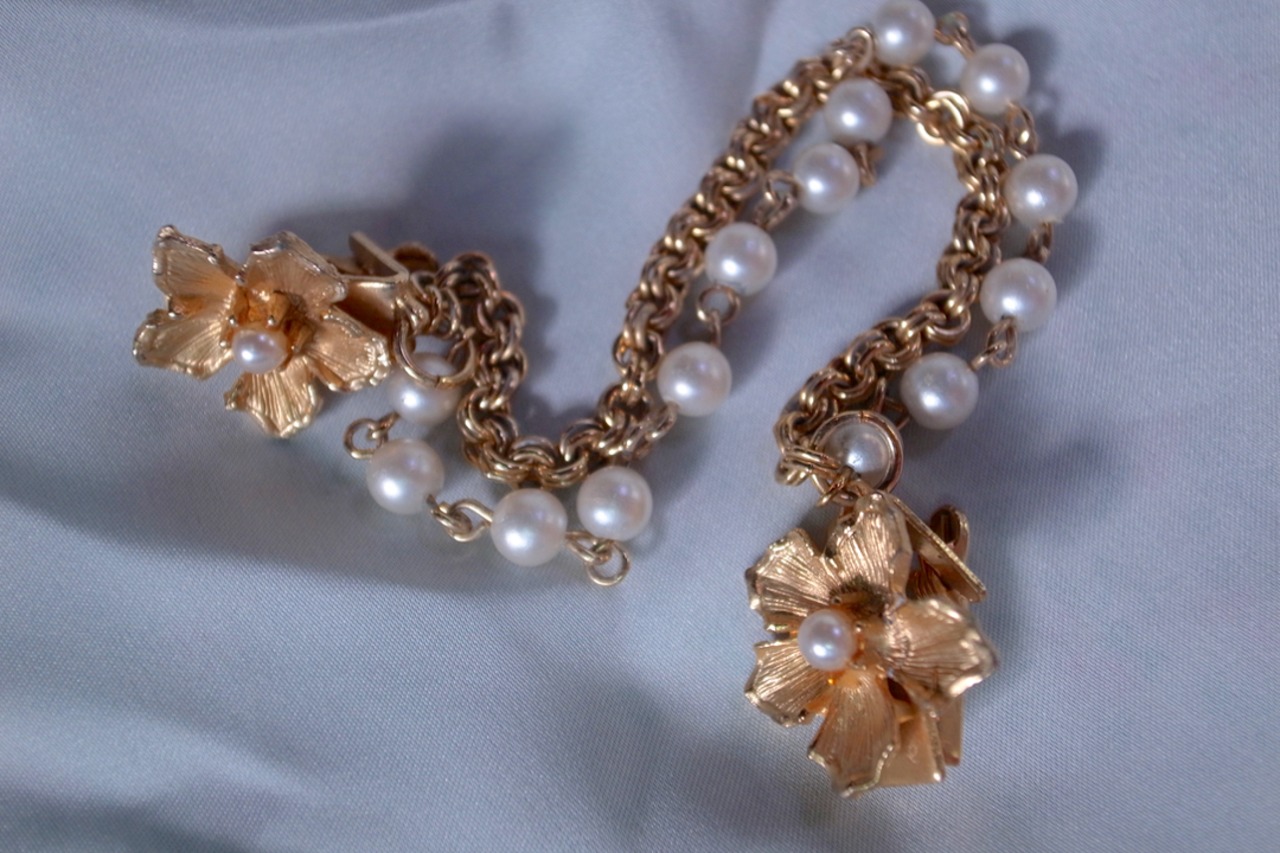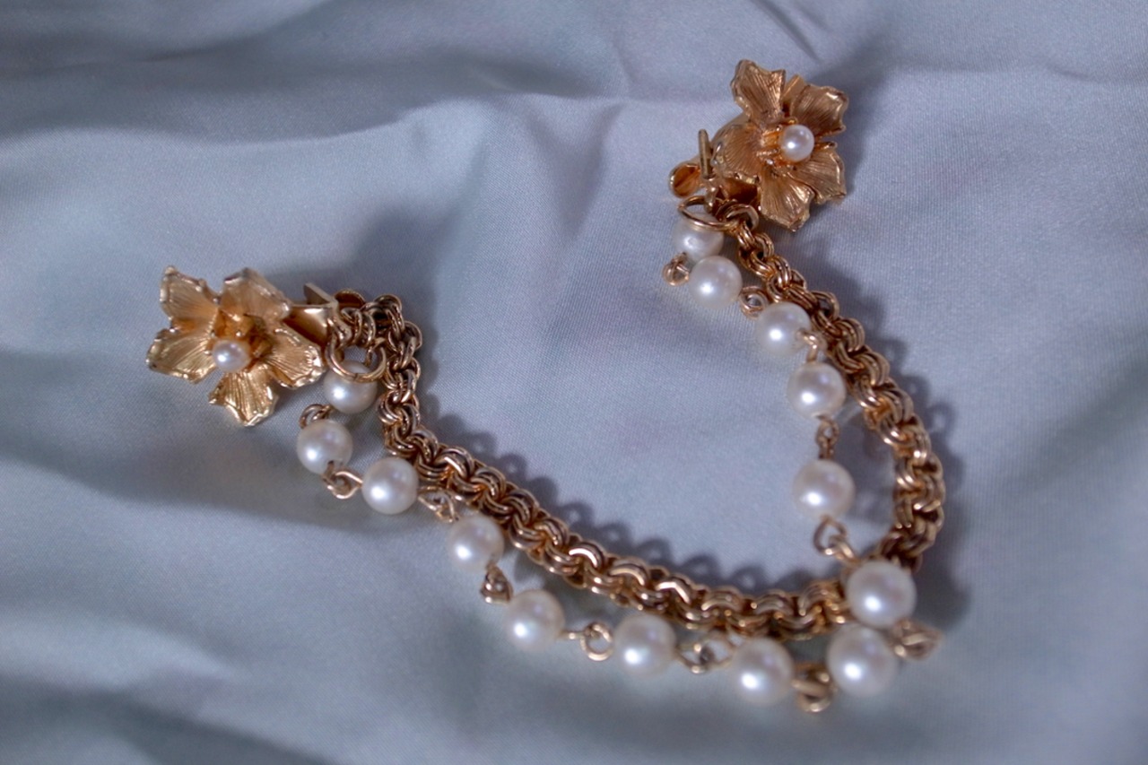 ヴィンテージ カーディガン・セータークリップ ゴールドとパールの花 パールのビーズのチェーン 60s