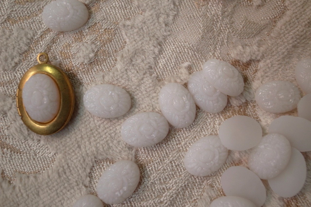 ヴィンテージ 白いばら模様のカボション ロケットペンダント 70’s チャーム 金色 アンティーク